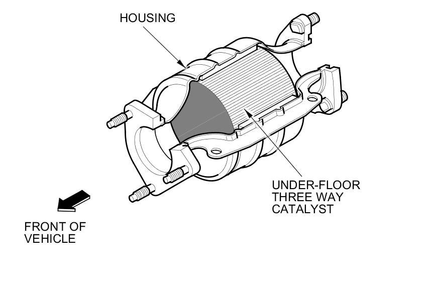 The WU-TWC/Under-Floor TWC converts hydrocarbons (HC), carbon monoxide (CO), and oxides of nitrogen (NOx) in the exhaust gas to carbon dioxide (CO2), nitrogen (N2), and water vapor.