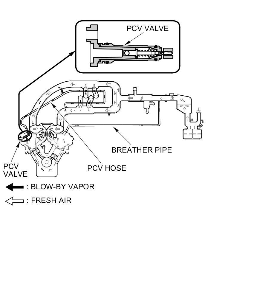The PCV valve prevents blow-by gasses from escaping into the atmosphere by venting them into the intake manifold.