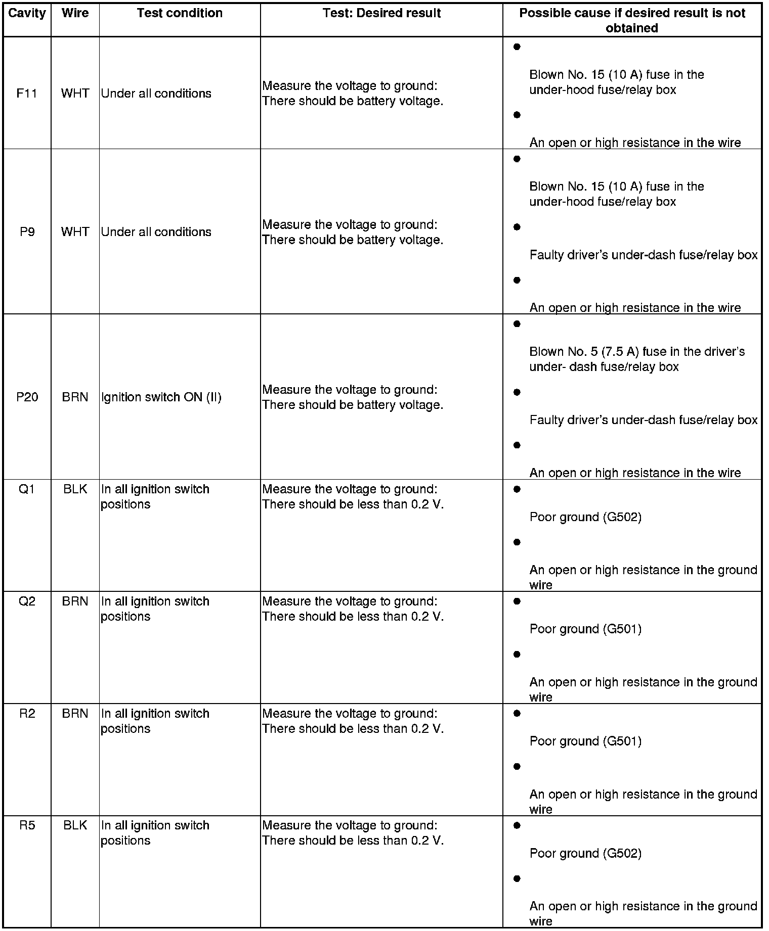 13. Turn the ignition switch to ON (II), and do the following input tests: