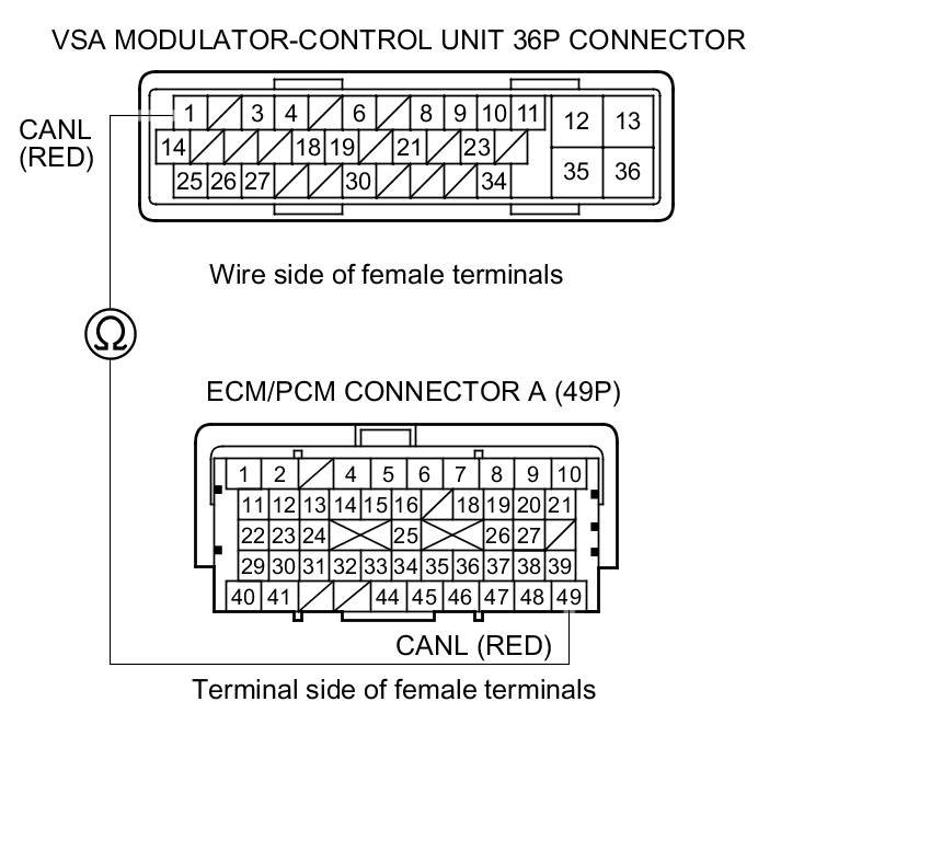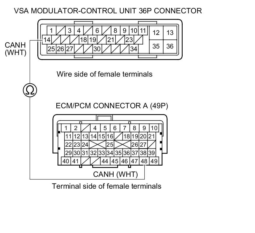 11. Check for continuity between ECM/PCM connector terminal A49 and VSA modulator-control unit 36P connector terminal No. 1.