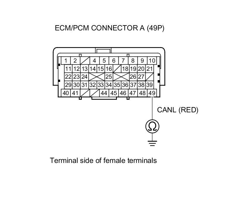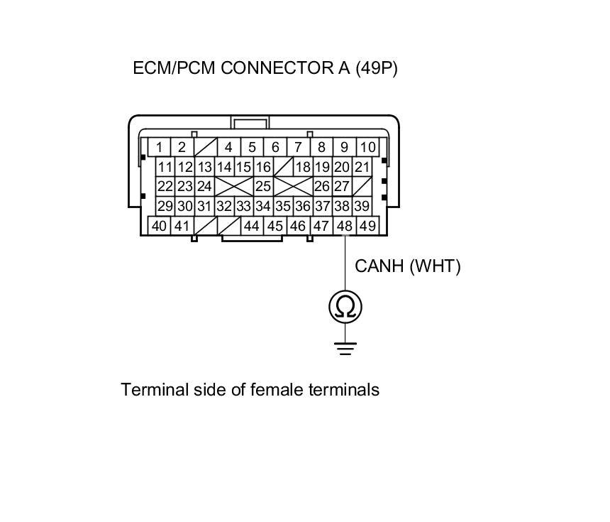 6. Check for continuity between ECM/PCM connector terminals A48 and A49.