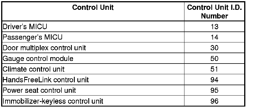 When an ECU on the CAN circuit is unable to communicate with other ECUs on the B-CAN and F-CAN circuits, the other control units set loss of communication DTCs. Use this chart to find the control unit that is not communicating with the other control units on the CAN circuit.