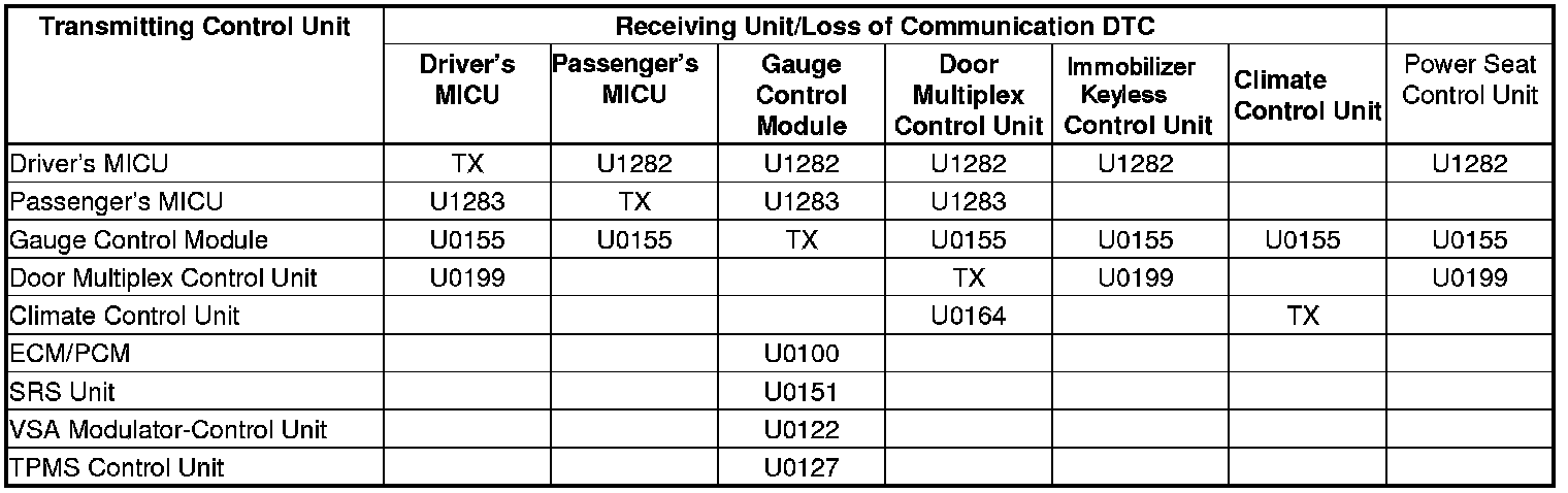 1. Find the Transmitting Control Unit that is in the same row as all of the loss of communication DTCs retrieved.
