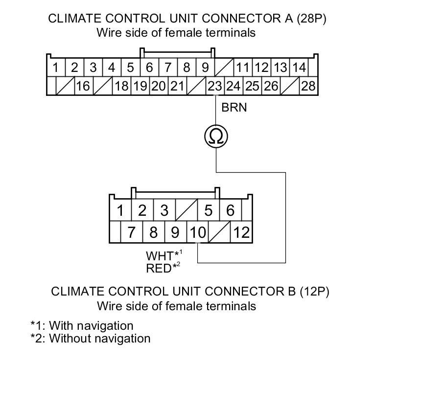 11. Measure the evaporator temperature sensor resistance between climate control unit connector A (28P) terminal No. 23 and connector B (12P) terminal No. 10.