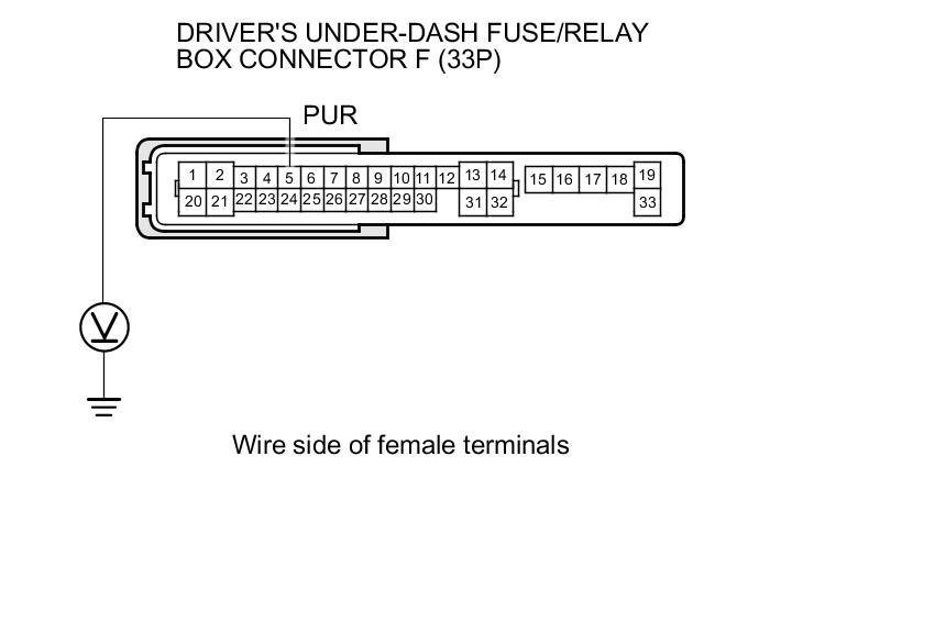 7. Measure the voltage between driver's under-dash fuse/relay box connector F (33P) terminal No. 5 and body ground.
