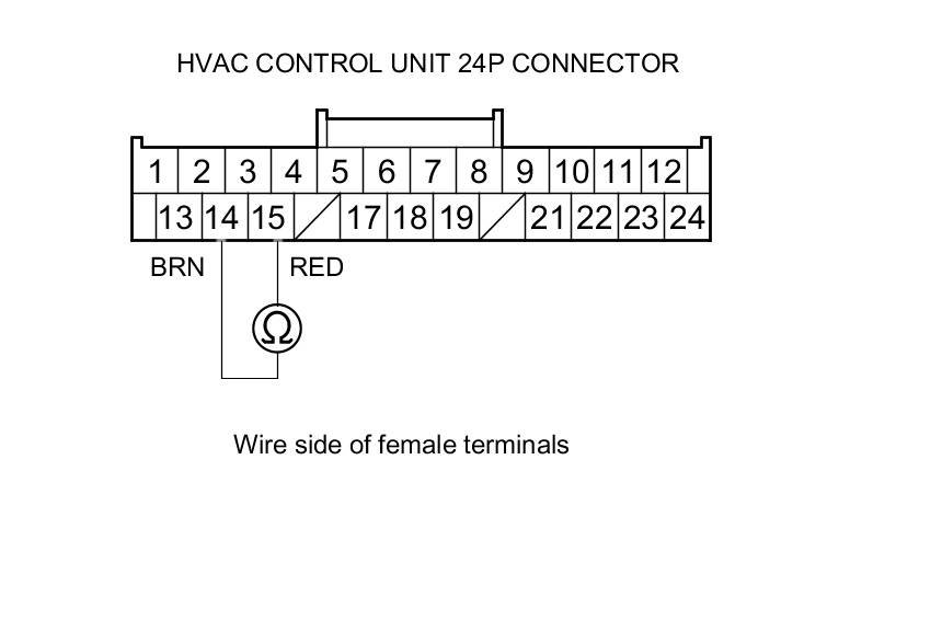 9. Measure the evaporator temperature sensor resistance between HVAC control unit 24P connector terminals No. 14 and No. 15.