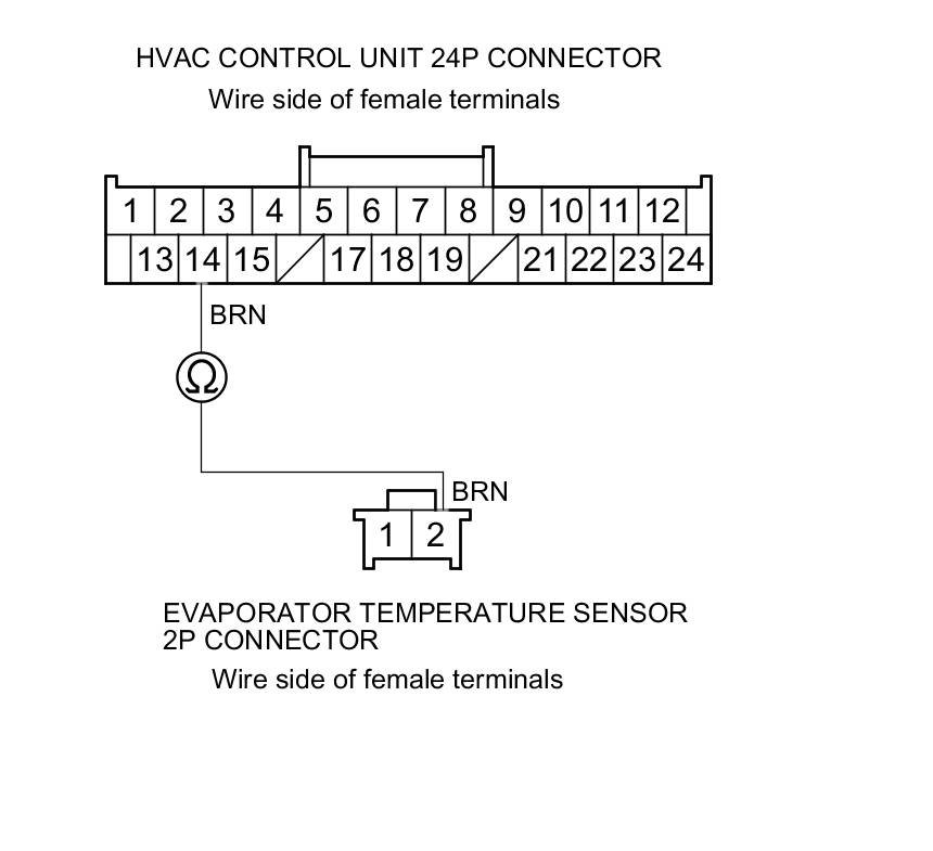 11. Check for continuity between HVAC control unit connector terminal No. 14 and evaporator temperature sensor 2P connector terminal No. 2.