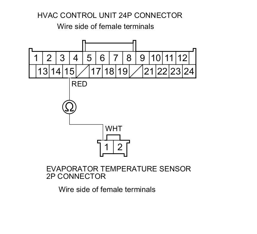 12. Check for continuity between HVAC control unit connector terminal No. 15 and evaporator temperature sensor 2P connector terminal No. 1.
