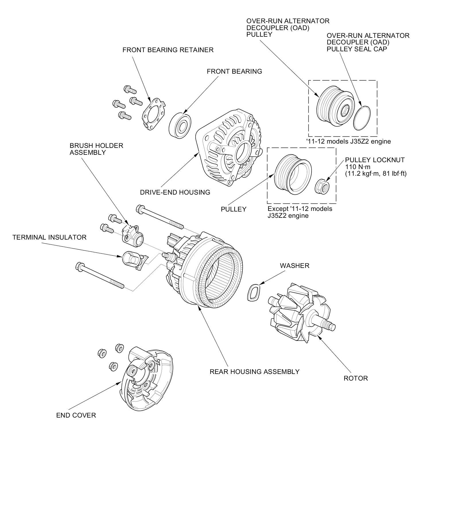 17. Except '11-12 models J35Z2 engine: If you removed the pulley, put the rotor in the drive-end housing, then torque its locknut to 110 Nm (11.2 kg-m, 81.0 lb-ft).