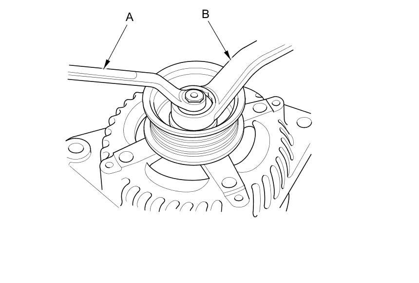 3. Except '11-12 models J35Z2 engine: If the front bearing needs replacing, remove the pulley locknut with a 10 mm wrench (A) and a 22 mm wrench (B). If necessary, use an impact wrench.