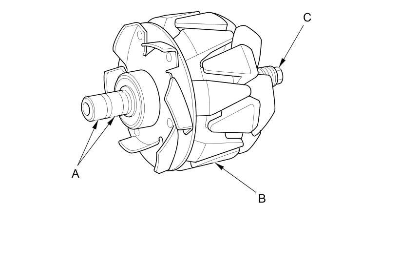 16. Check for continuity between each slip ring and the rotor (B) and the rotor shaft (C):