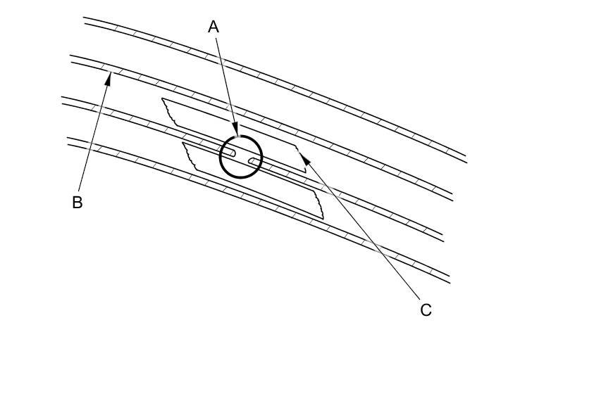 2. Carefully mask above and below the broken portion of the defogger wire (B) with cellophane tape (C).