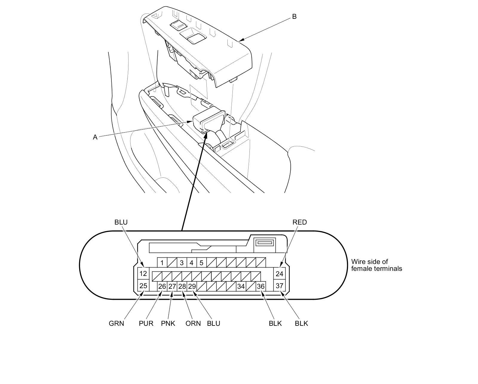 3. Disconnect the 37P connector (A) from the front passenger's power window switch (B).