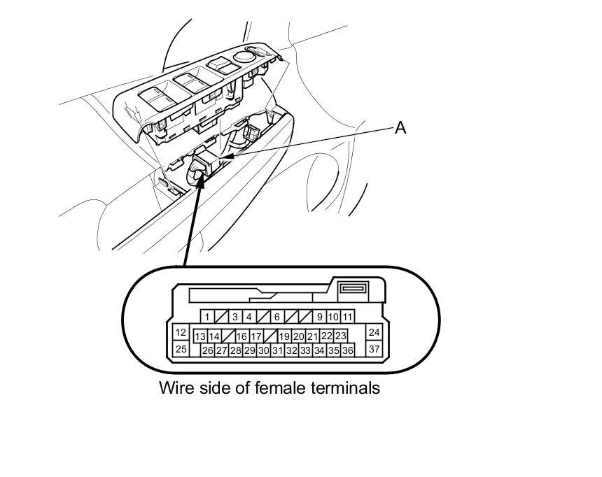 2. Test the driver's power window motor in each direction by connecting battery power and ground to the power window master switch 37P connector (A) according to the table.