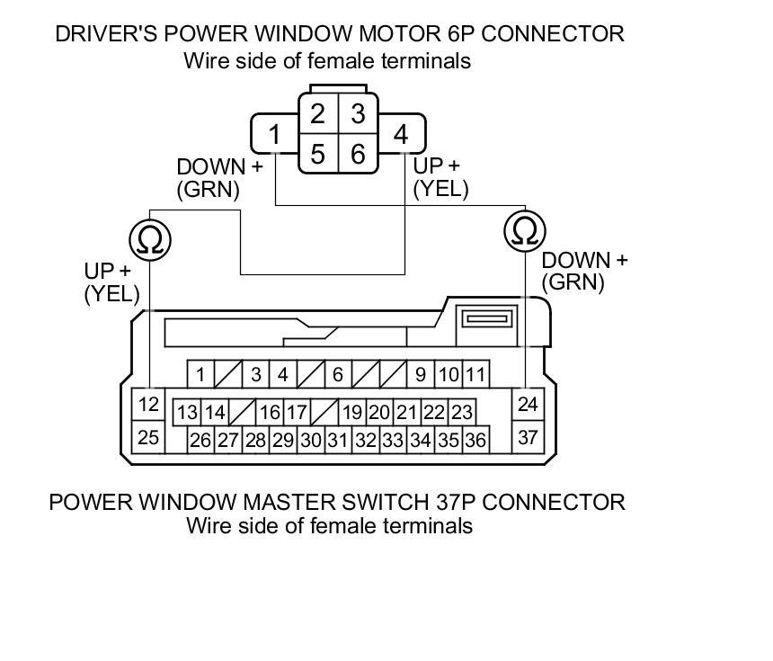 6. Check for continuity between the power window master switch 37P connector terminals and driver's power window motor 6P connector terminals as shown. There should be continuity.