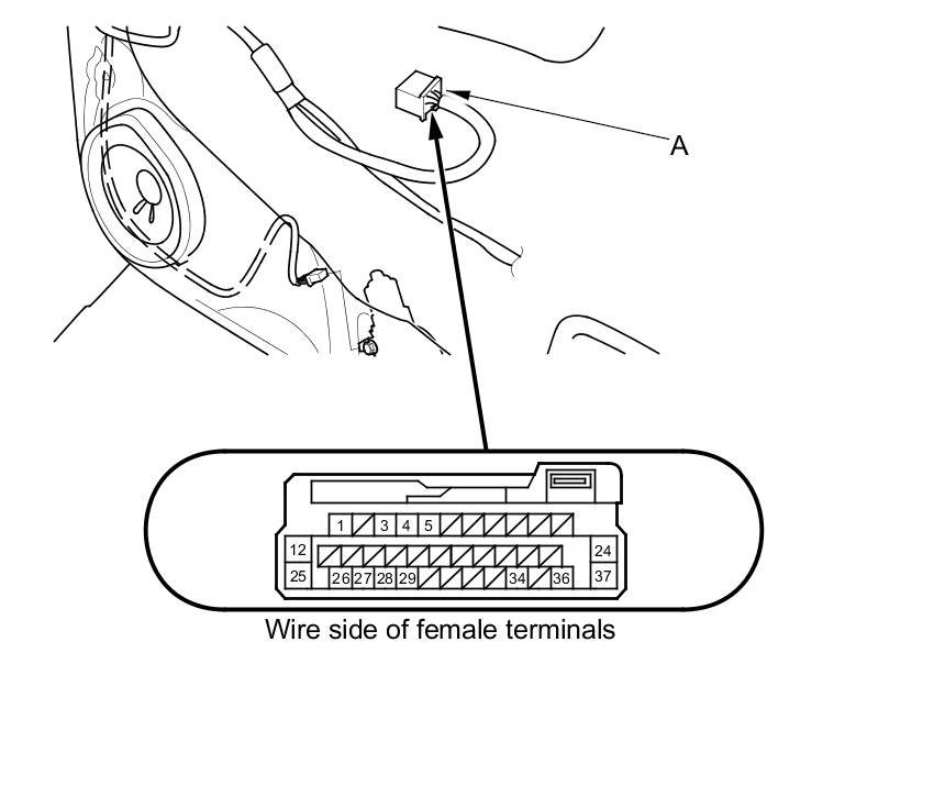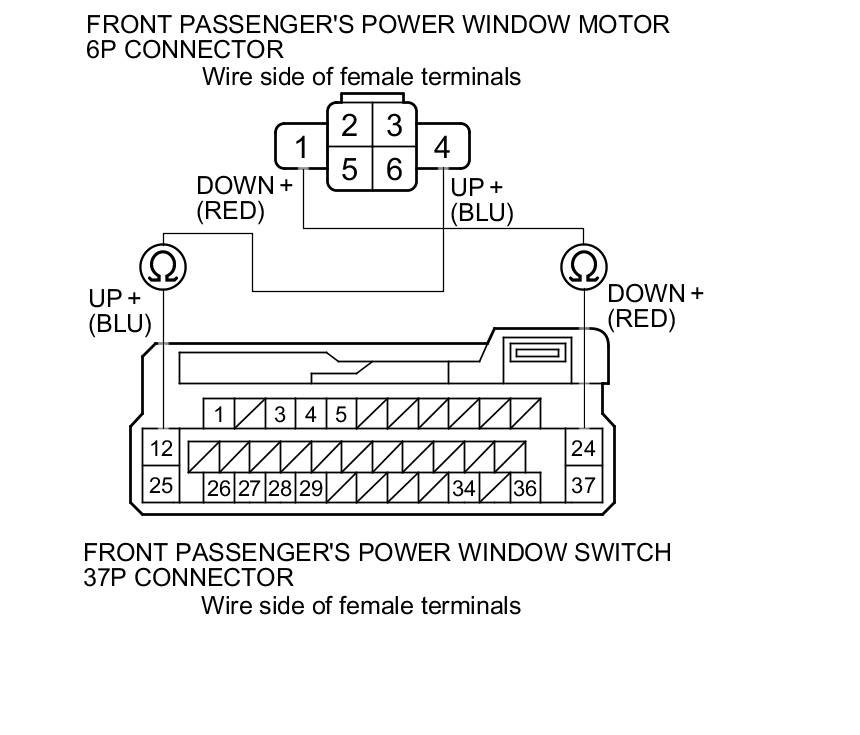 6. Check for continuity between the front passenger's power window switch 37P connector terminals and front passenger's power window motor 6P connector terminals as shown. There should be continuity.