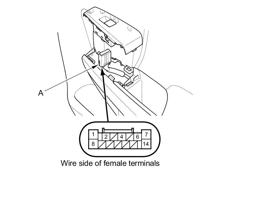 2. Test the rear power window motor in each direction by connecting battery power and ground to the rear power window switch 14P connector (A) according to the table.
