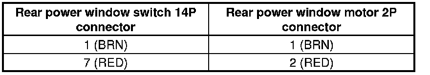 6. Check for continuity between the rear power window switch 14P connector terminals and rear power window motor 2P connector terminals as shown. There should be continuity.