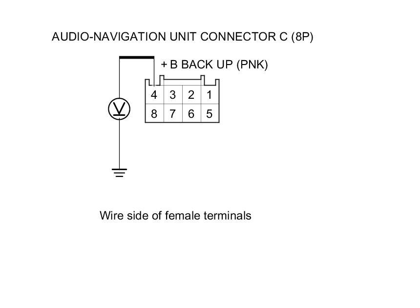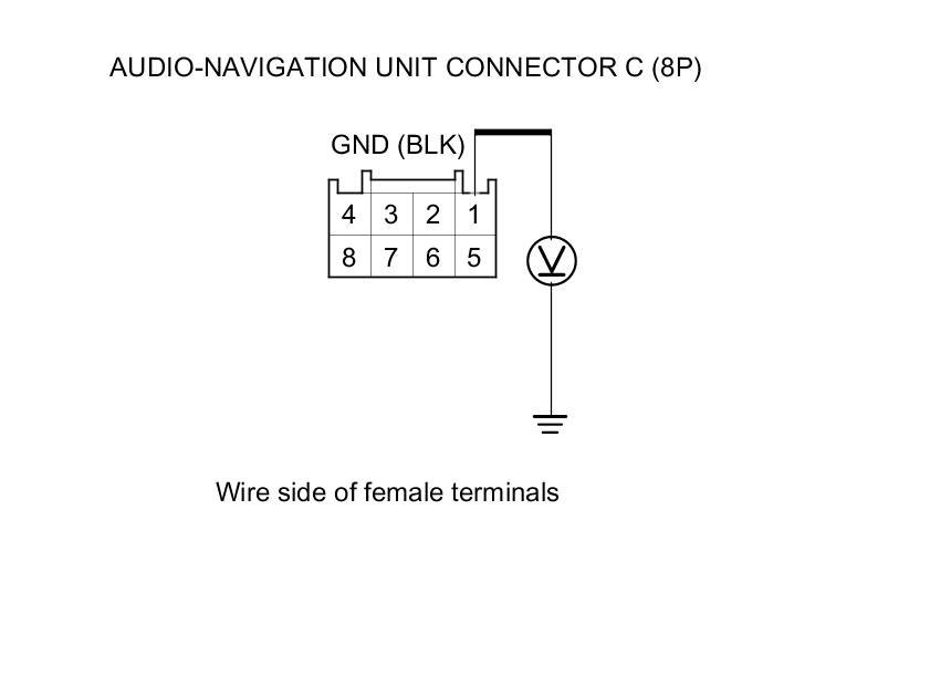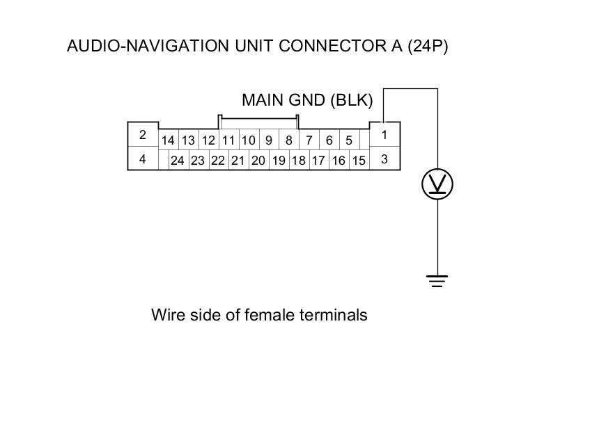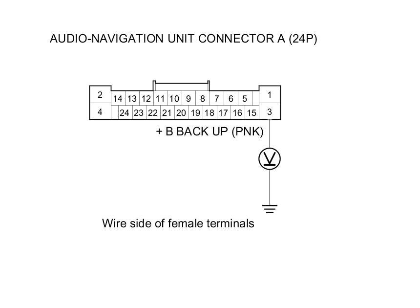2. Measure the voltage between audio-navigation unit connector A (24P) terminal No. 3 and body ground, and between audio-navigation unit connector C (8P) terminal No. 4 and body ground.