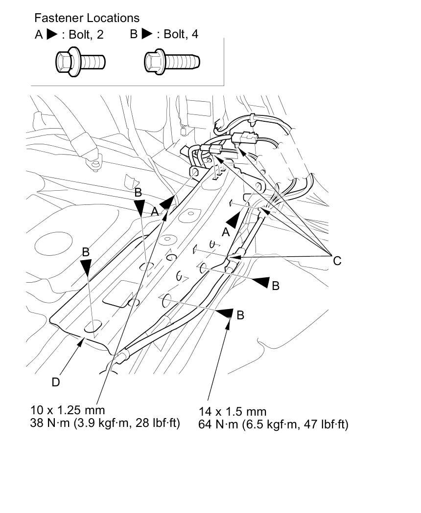 2. Remove the carpet as needed, remove the bolts (A, B) and detach the harness clips (C), then remove the middle crossmember gusset (D).