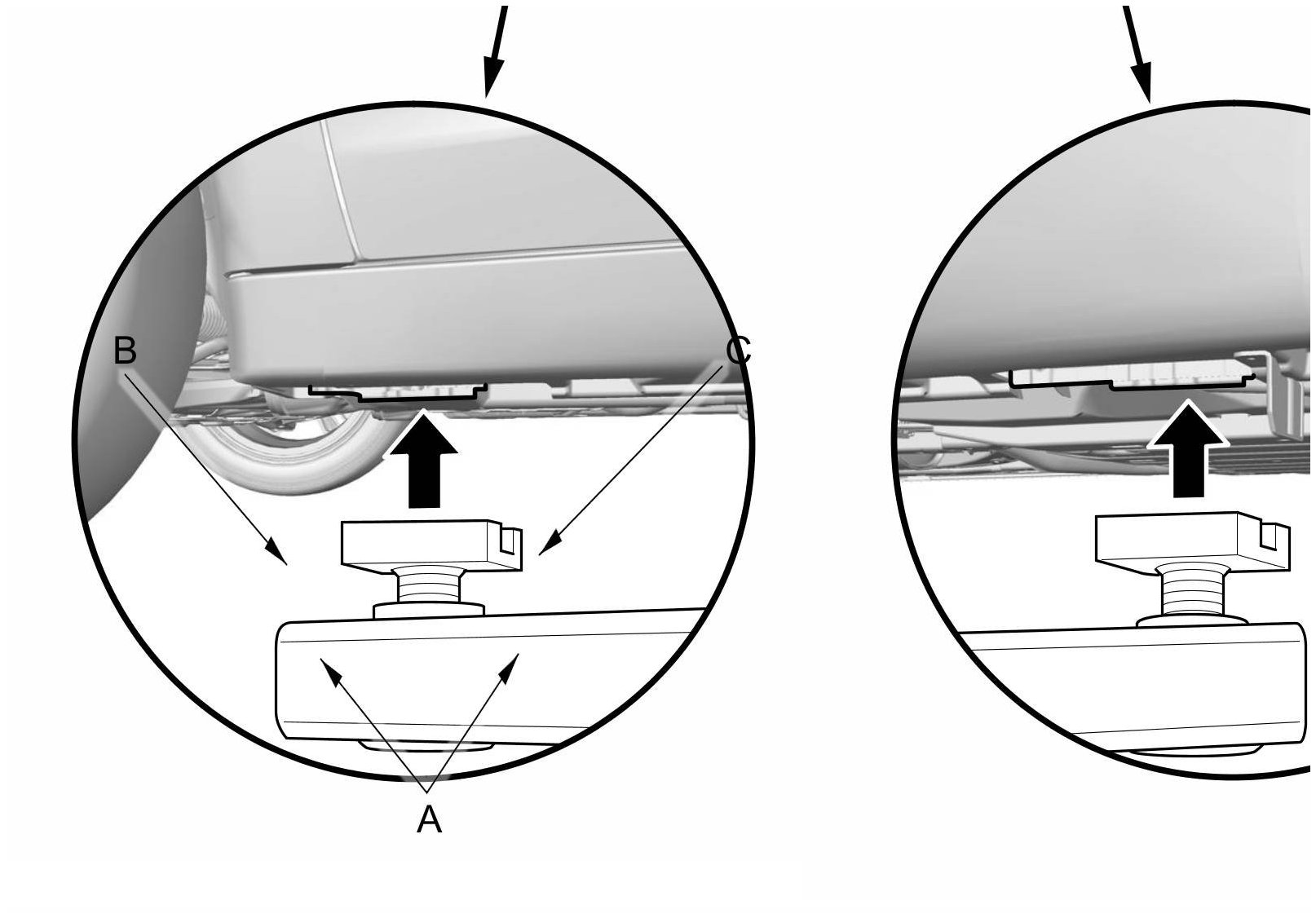1. Position the lift blocks (A), under the vehicle's front support points (B) and rear support points (C).
