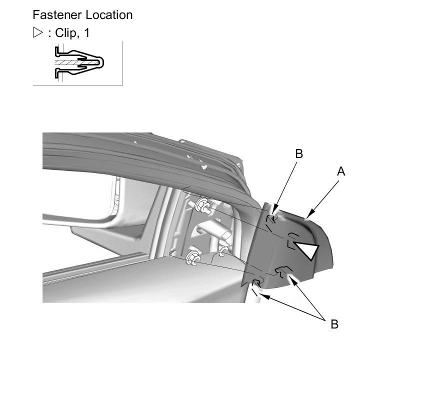2. Carefully pull out the door mirror cover (A) to release the hooks (B) and detach the clip, then remove it.
