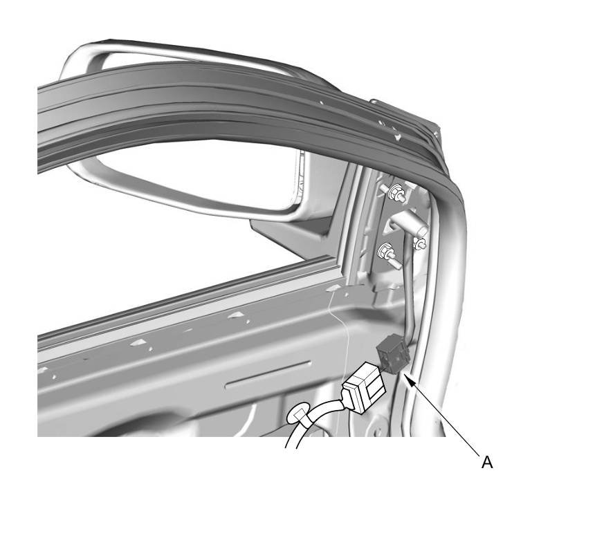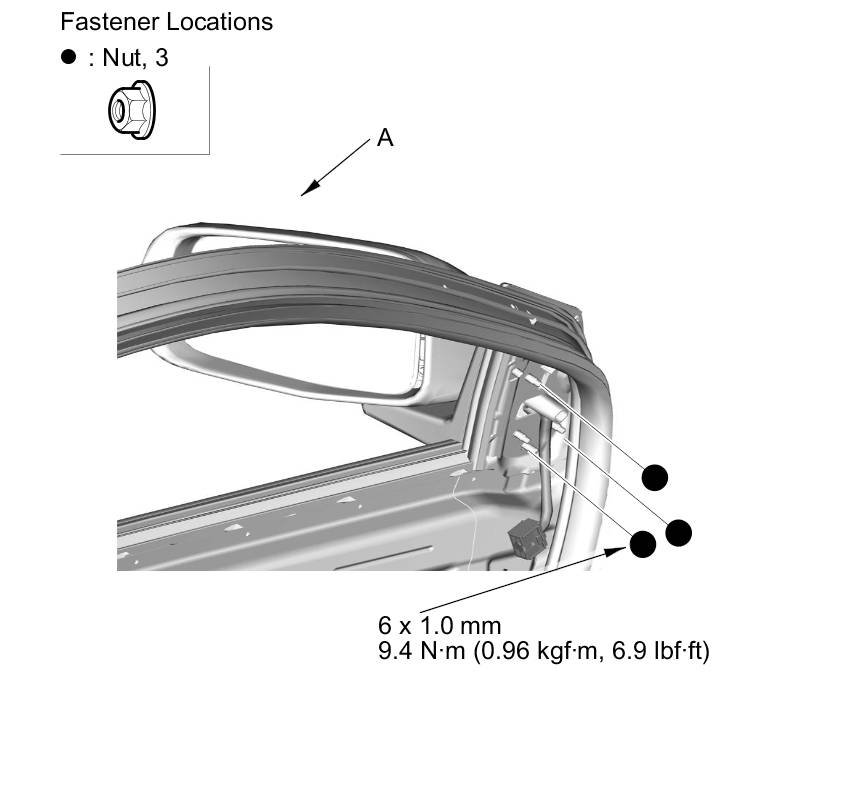 5. While holding the power mirror (A), remove the nuts securing the mirror.
