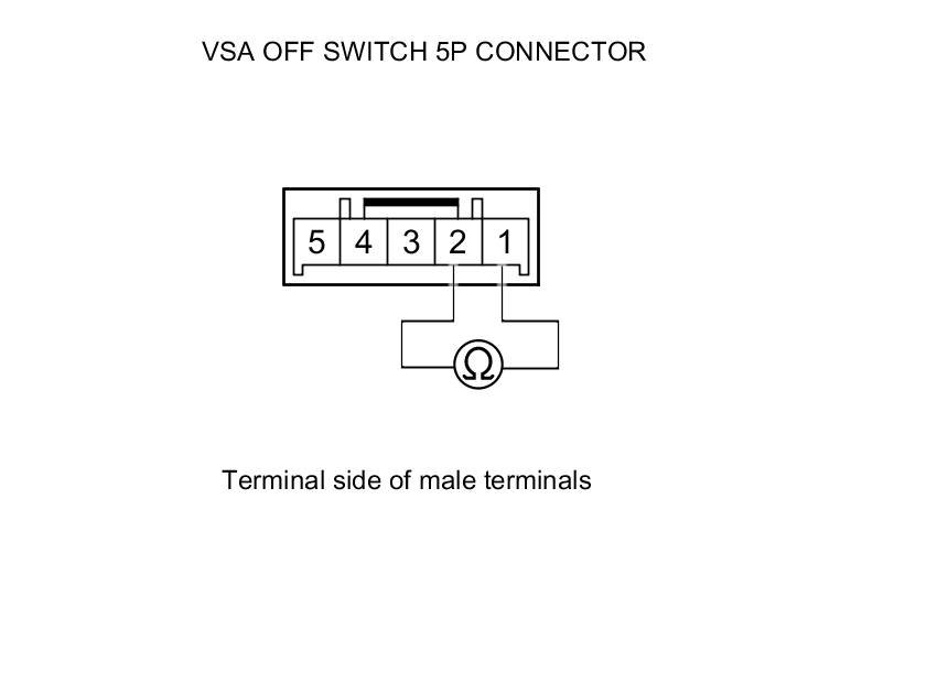 5. On the switch side, check for continuity between VSA OFF switch 5P connector terminals No. 1 and No. 2. There should be continuity at all times.