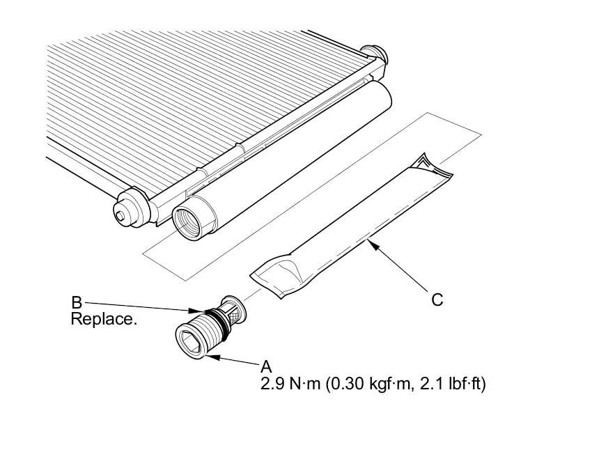 2. Remove the cap (A) from the bottom of the A/C condenser. Remove the O-ring (B) and the desiccant (C).