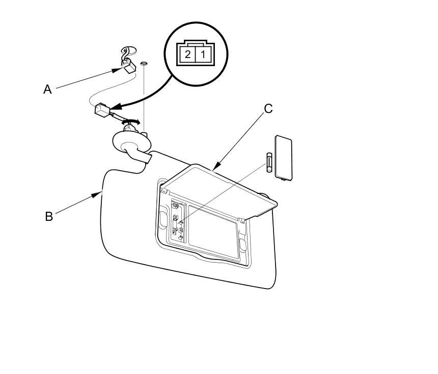 4. If the continuity is not as specified, check the bulbs (D). If the bulbs are OK, replace the sunvisor Service and Repair.