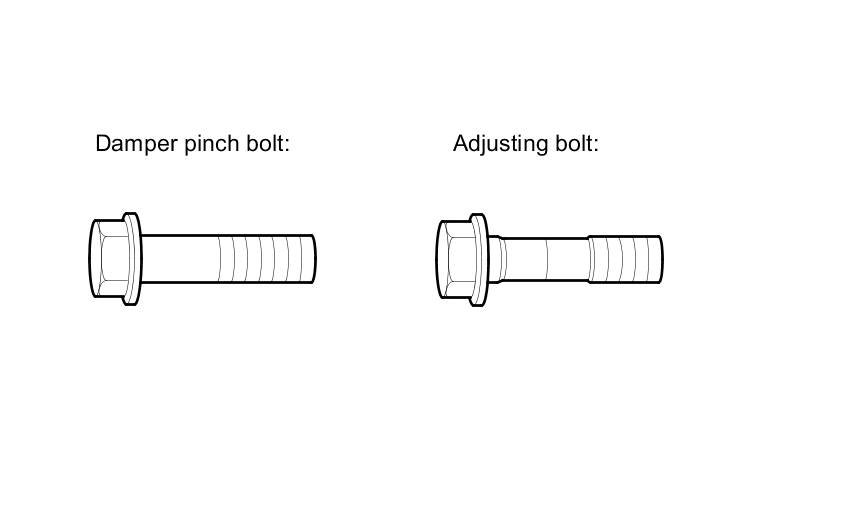 The front camber can be adjusted by exchanging one or both of the damper pinch bolts with the smaller diameter adjusting bolt(s). The difference between the adjusting bolt diameter and the pinch bolt hole diameter allows for a small range of adjustment.