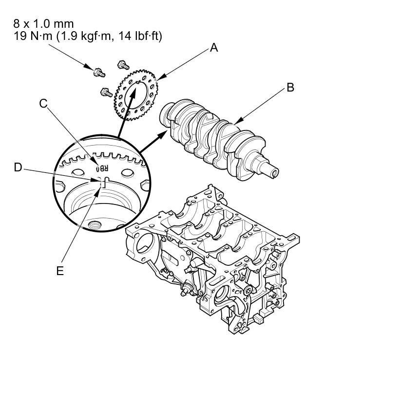 3. Install the CKP pulse plate on the crankshaft (B); face the marked side (C) toward the transmission, and align the tab (D) on the CKP pulse plate with the groove (E) on the crankshaft.