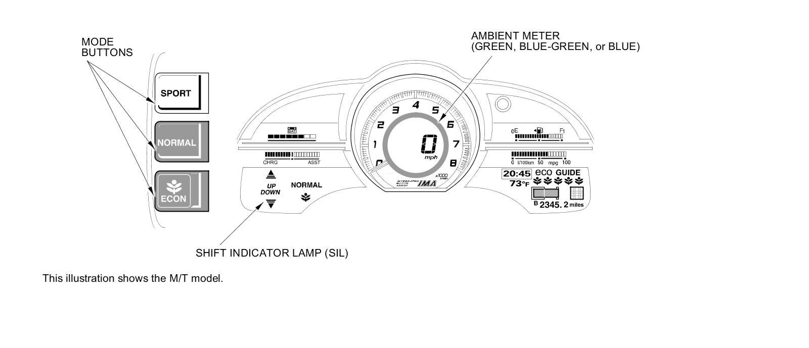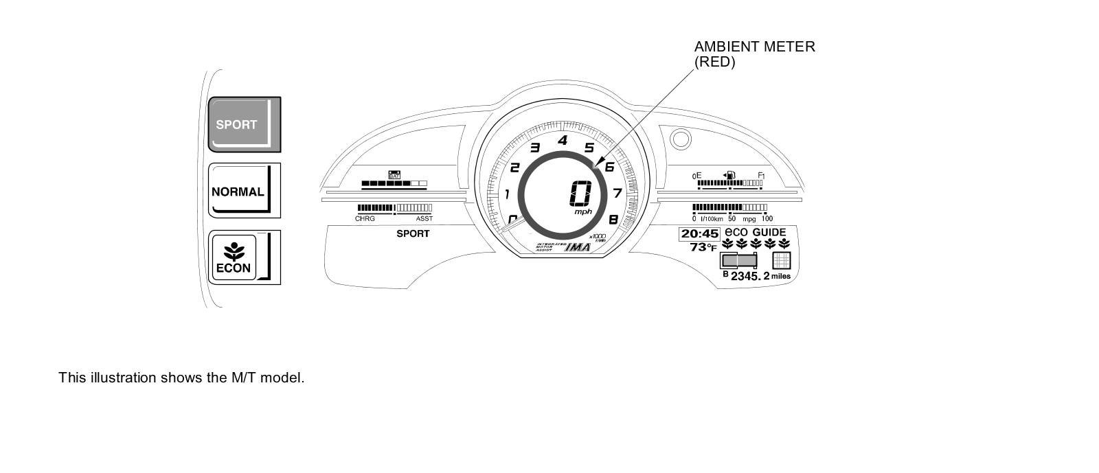 In Sport mode, the ambient meter color is red at all times, and the shift indicator lamp (SIL) stays off (M/T).