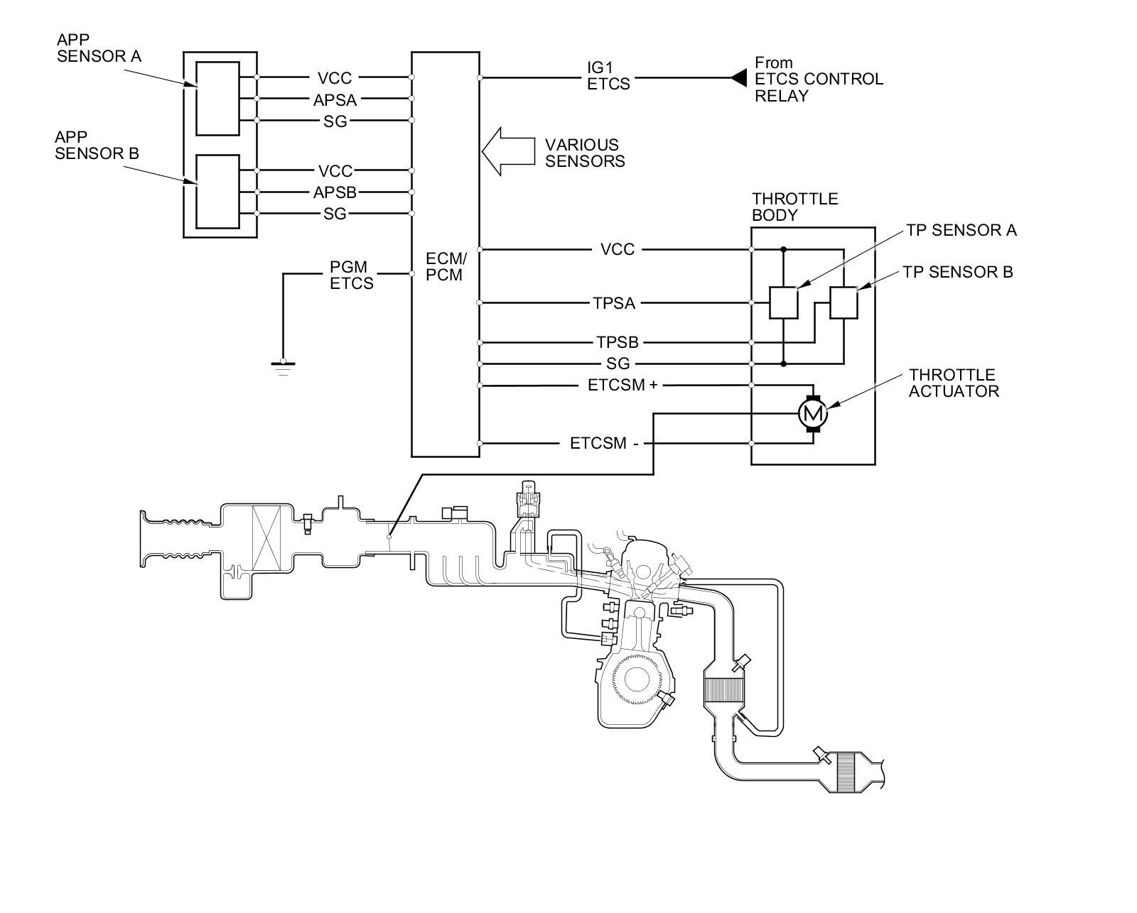 The electronic throttle control system consists of the throttle actuator, TP sensor A/B, the APP sensor A/B, the ETCS control relay, and the ECM/PCM.