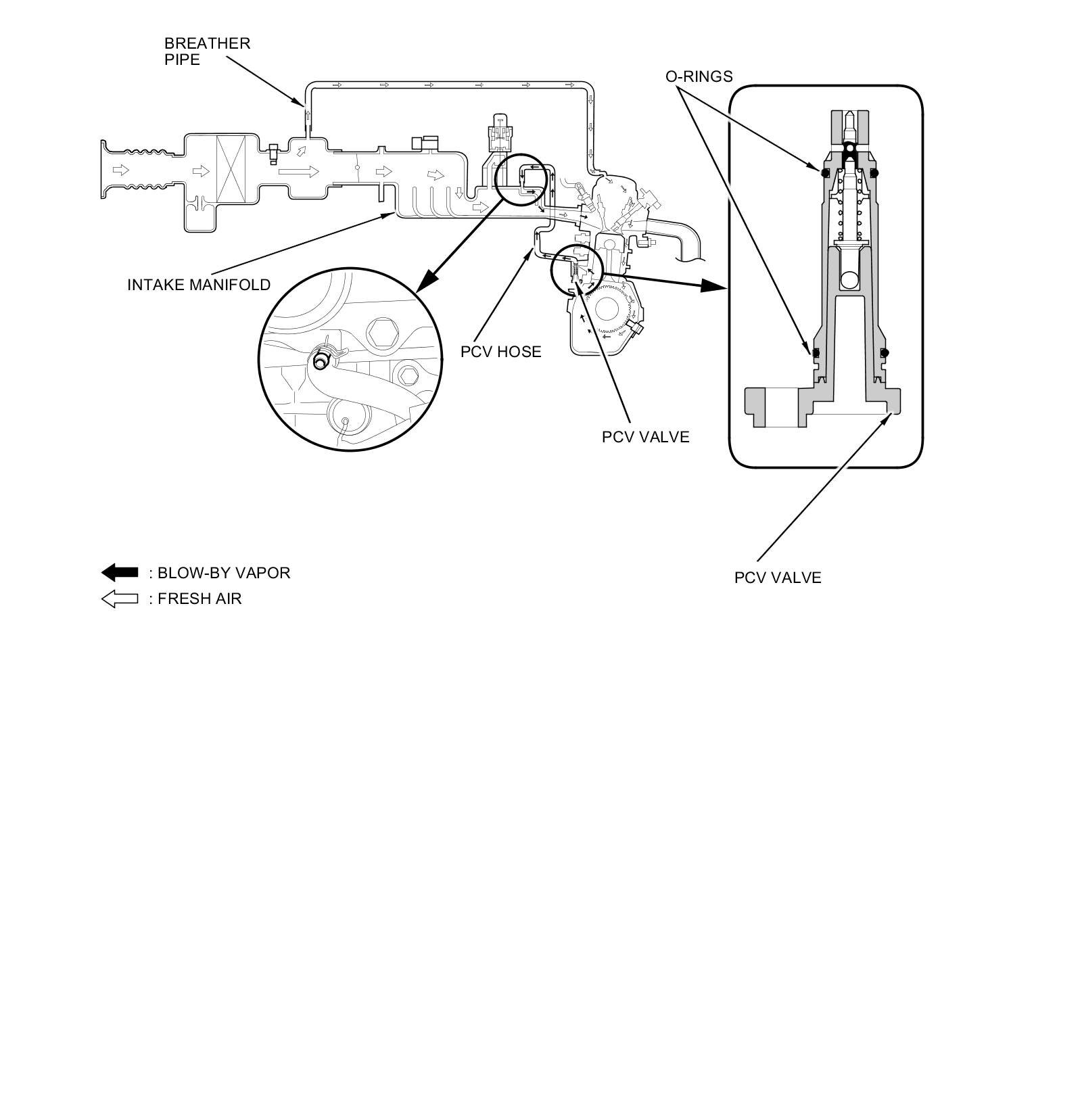 The PCV valve prevents blow-by gases from escaping into the atmosphere by venting them into the intake manifold.