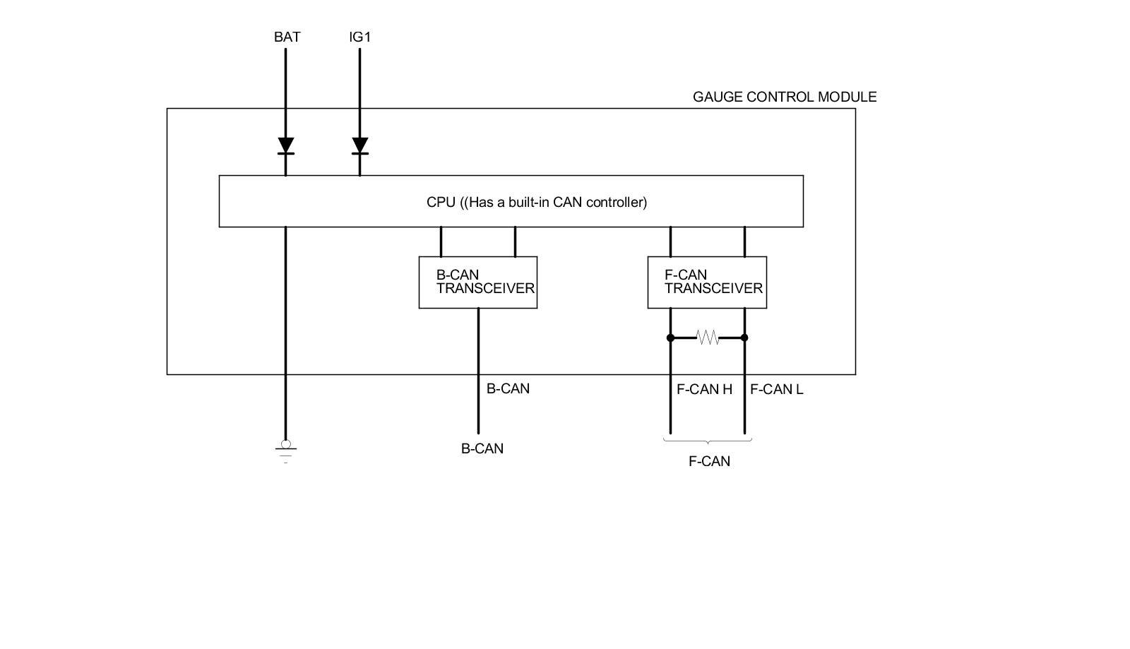 The gauge control module acts as a gateway to allow both systems to share information. The gauge control module translates and relays the information from B-CAN to F-CAN and from F-CAN to B-CAN.