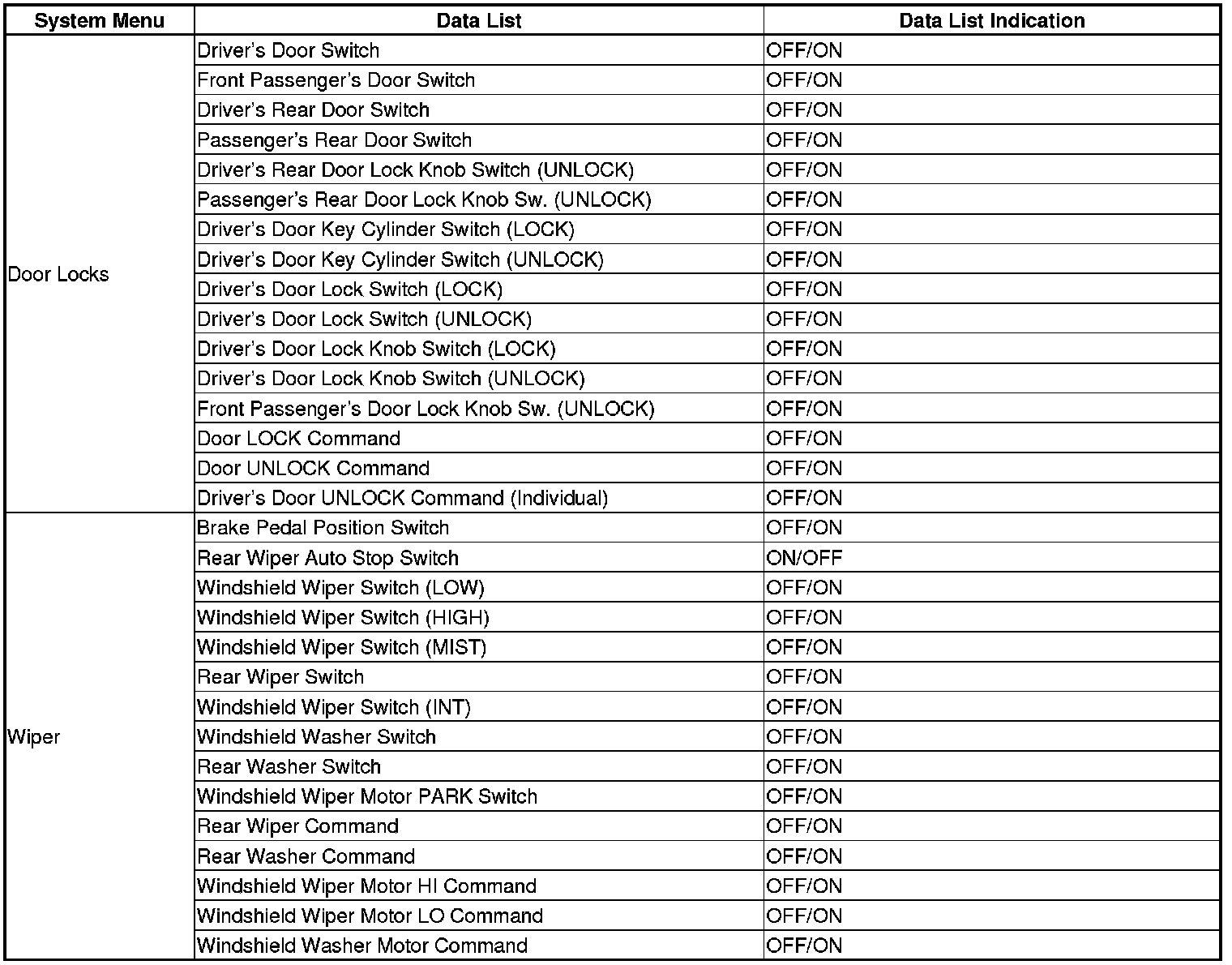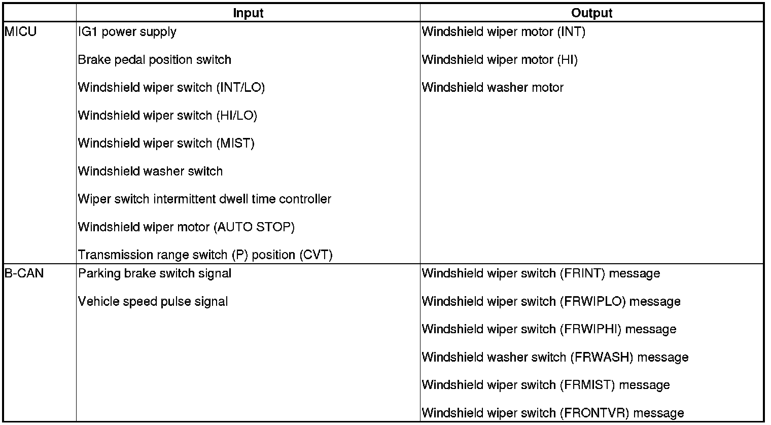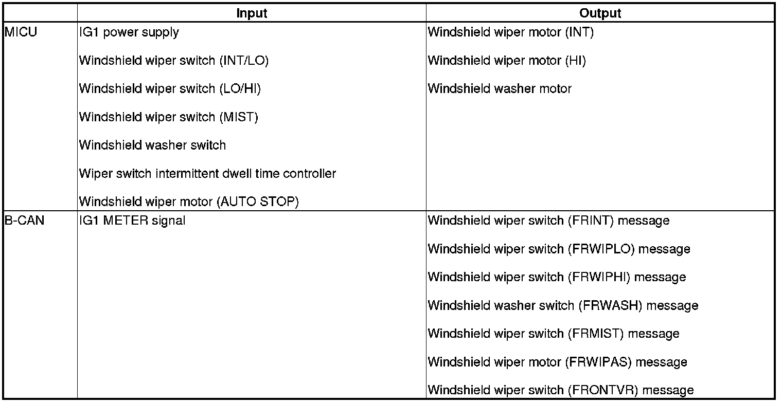 The MICU controls the windshield wiper motor and the windshield washer motor based on inputs from each switch and B-CAN signals.
