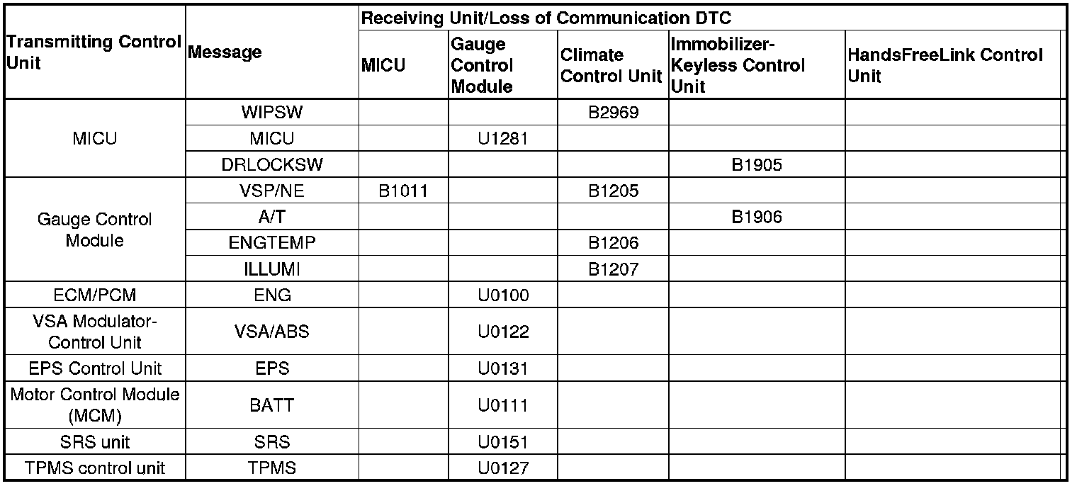 When an ECU on the CAN circuit is unable to communicate with other ECUs on the CAN circuit, the other control units set loss of communication DTCs. Use this chart to find the control unit that is not communicating with the other control units on the CAN circuit.