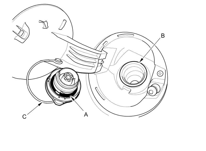 2. Check the fuel fill cap seal (A) and the fuel fill pipe mating surface (B). Make sure the fuel fill cap tether cord (C) is not caught under the cap.