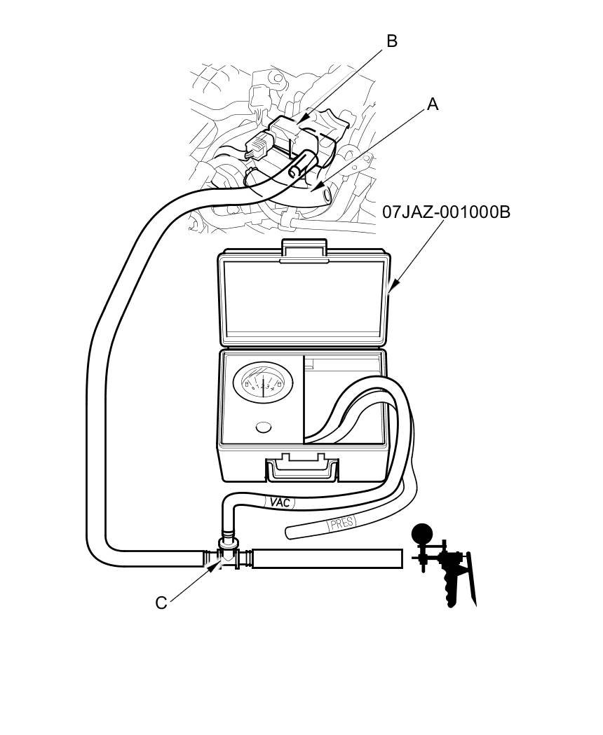 8. Disconnect the vacuum hose (purge line) (A) from the EVAP canister purge valve (B) in the engine compartment, then connect a T-fitting (C), a vacuum gauge, and a vacuum pump/gauge, 0-30 in.Hg, to the EVAP canister purge valve as shown.