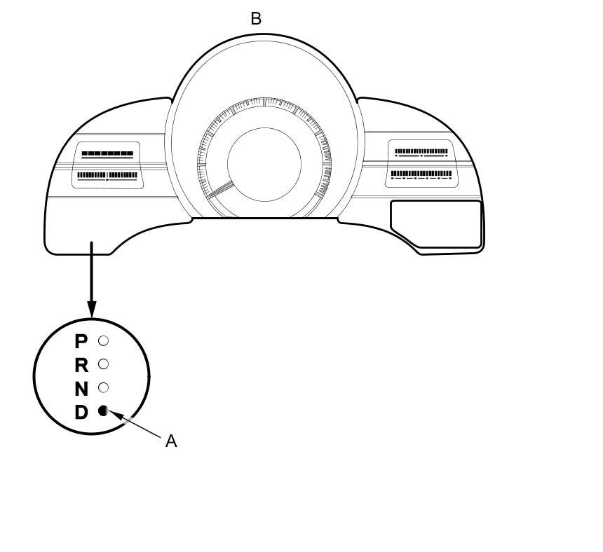 When the powertrain control module (PCM) senses an abnormality in the input or output system, the D indicator (A) in the gauge control module (B) will usually blink.