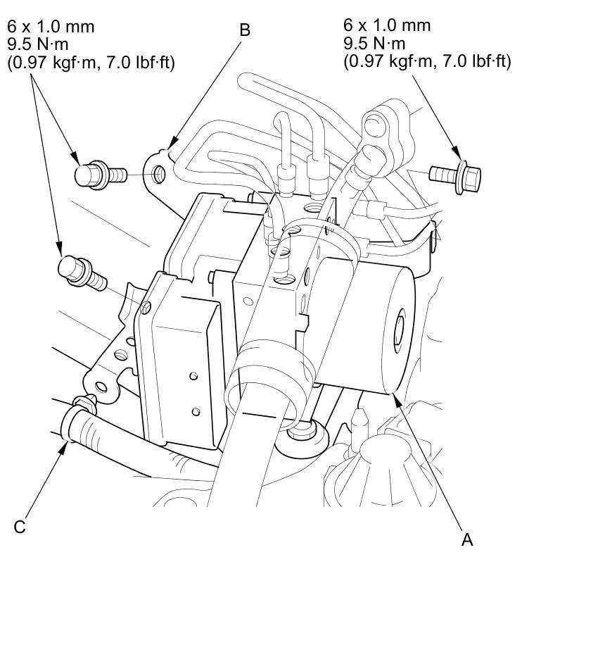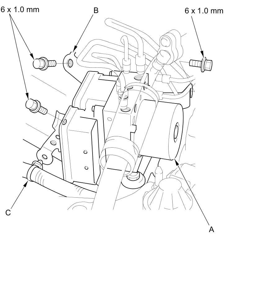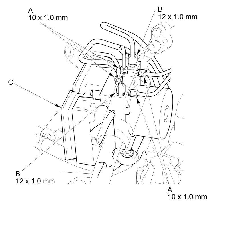 2. Disconnect the 10 mm brake lines (A) and the 12 mm brake lines (B) from the VSA modulator-control unit (C).