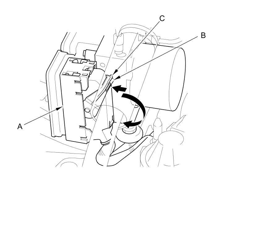 3. Disconnect the VSA modulator-control unit 32P connector (A) by pushing the lock (B) and pulling down the lever (C); the connector disconnects itself.