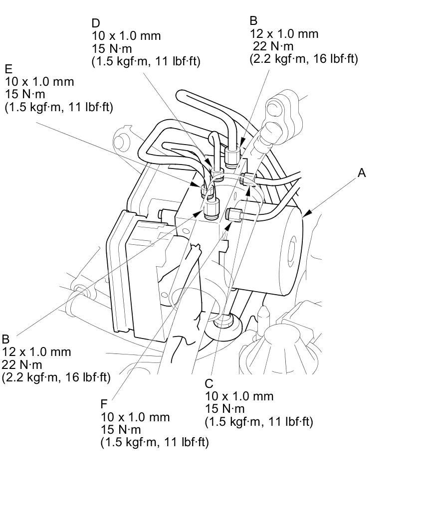 6. Connect the 10 mm brake lines and the 12 mm brake lines to the VSA modulator-control unit (A).
