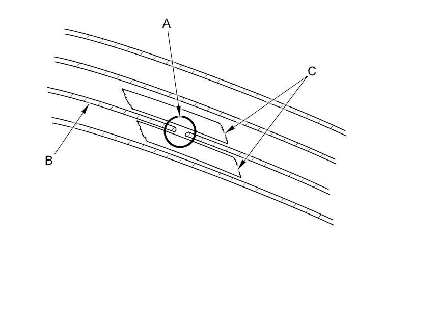 2. Carefully mask above and below the broken portion of the rear antenna ground (B) with cellophane tape (C).
