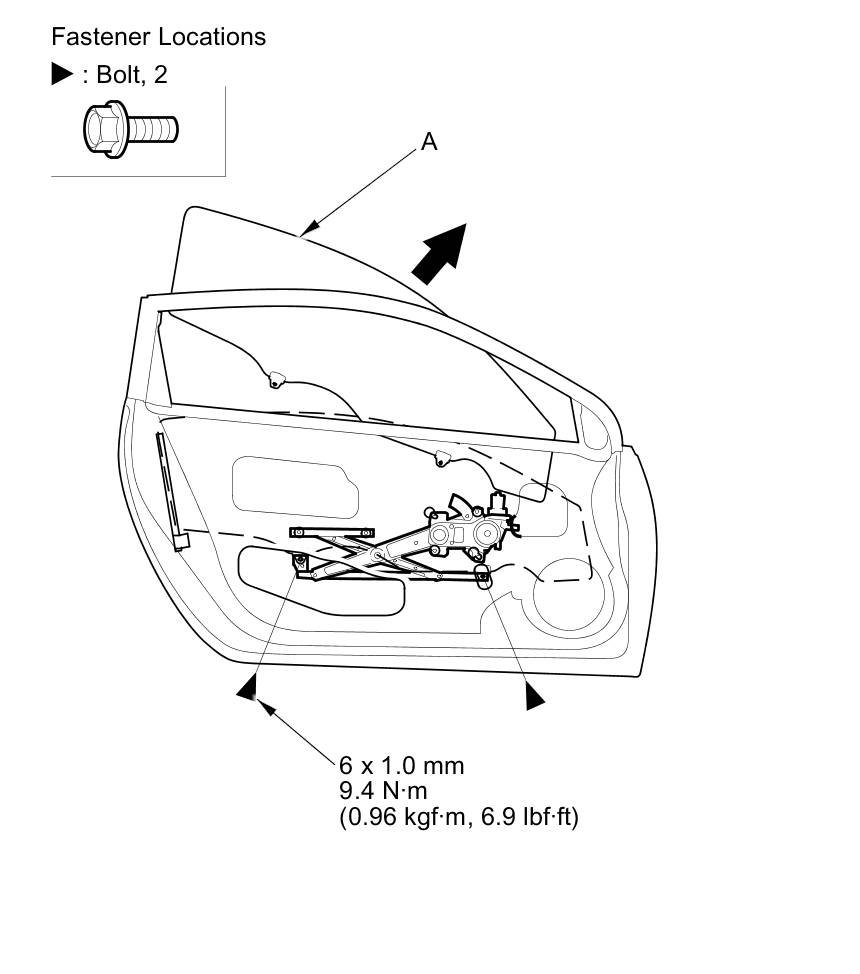 4. Carefully raise the glass (A) until you can see the bolts, then remove them. Carefully pull the glass out through the window slot.