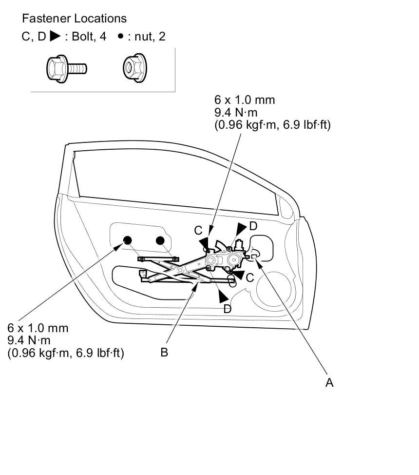 6. Remove the bolts (D) and nuts, then remove the regulator through the hole in the door.