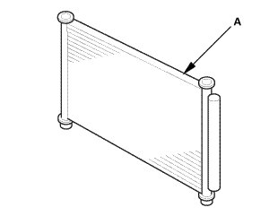 5. Check the A/C condenser (A) for material clogging the fins (dirt, insects, etc.). If the A/C condenser is clogged or restricted, carefully clean any material from the A/C condenser fins with water and detergent. If deeper cleaning is required, clean the fins with HondaBrite cleaner. Be sure to dry the A/C condenser completely.