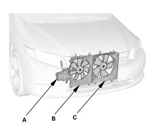 12. Check that the A/C condenser fan (B) and the radiator fan (C) operate when the A/C compressor clutch is engaged and blow air toward the engine compartment. If one or both of the fans is not working properly, refer to the symptom troubleshooting.