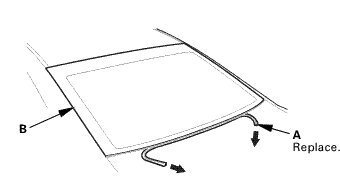 5. Remove the lower rubber dam (A) from the lower edge of the rear window (B). If necessary, cut the molding with a utility knife.